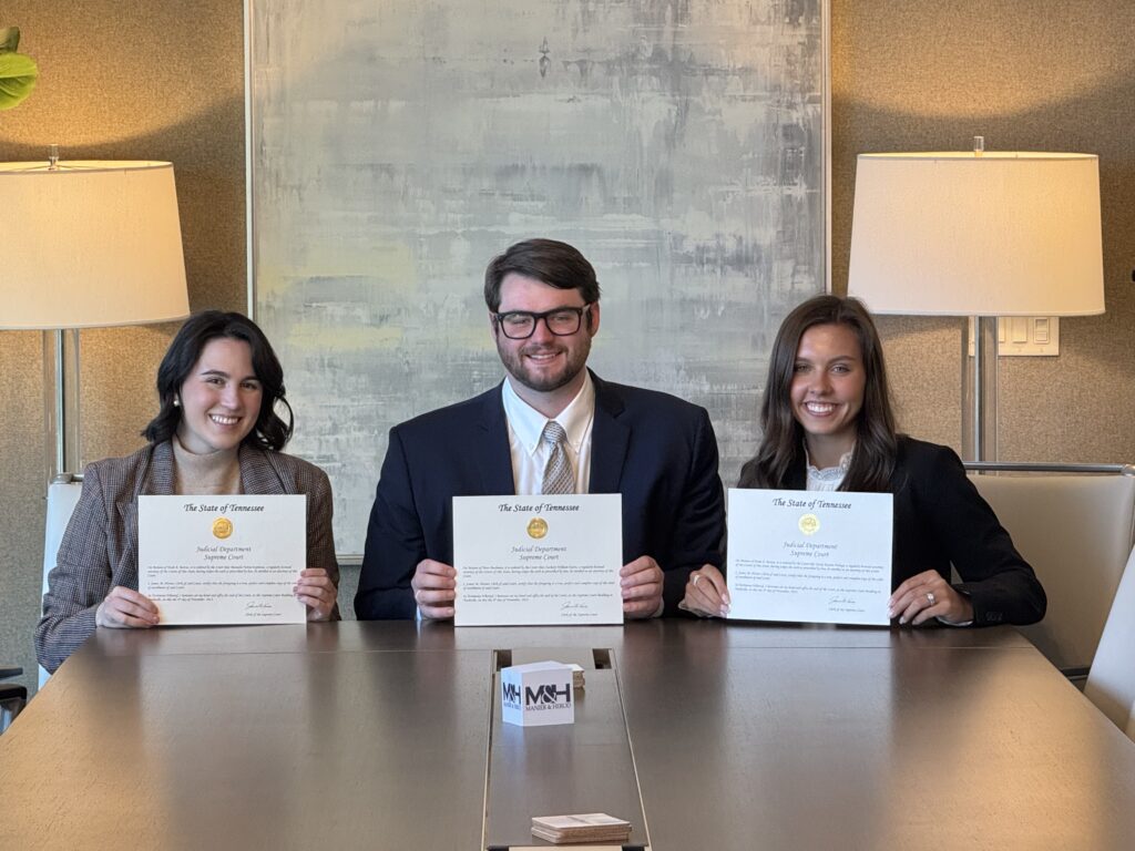 Manier & Herod congratulates its associates Manuela Espinosa, Kealy Welage, and Zach Kurtz, who were sworn in before the Tennessee Supreme Court on November 4, 2025. Manuela, Kealy, and Zachary are each Belmont College of Law graduates who first joined Manier & Herod as summer associates in 2024. Manuela has excelled as a member of the firm’s workers’ compensation group while Kealy and Zach are rising stars in Manier’s surety & fidelity group. We are proud to celebrate this achievement with them and look forward to their continued success at the firm. Each of these three associates embodies Manier & Herod’s Core Values of Integrity, Excellence, Advocacy, and Impact.